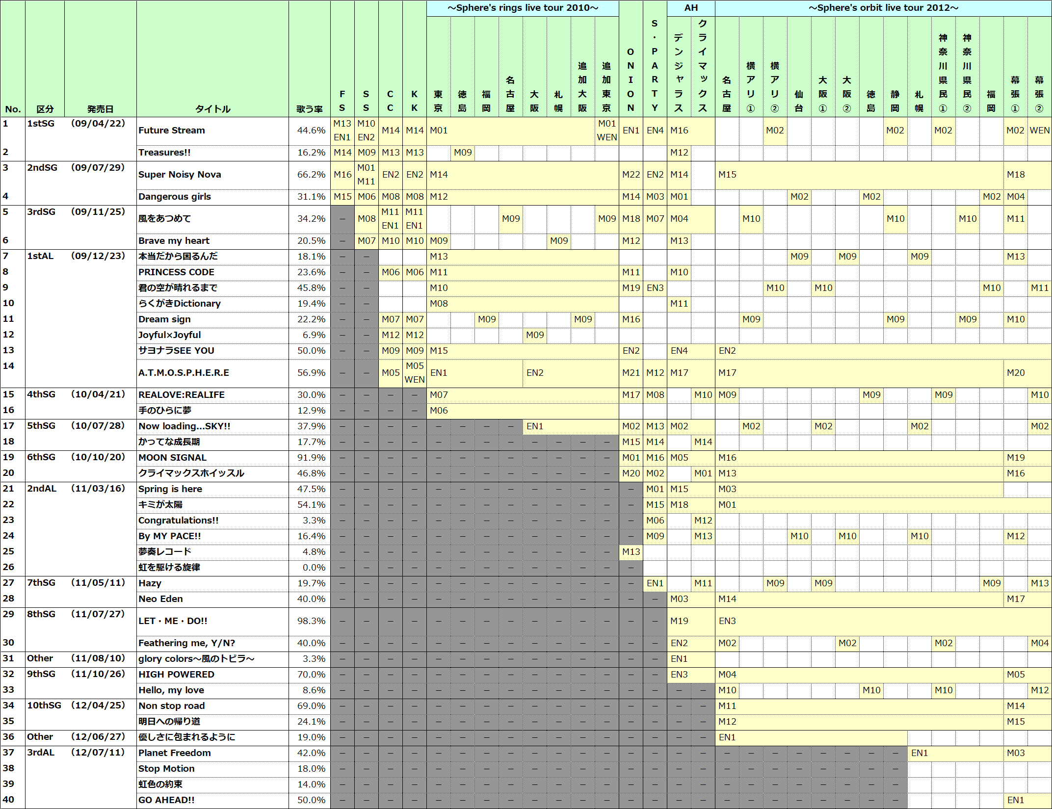 スフィアのワンマンライブ、セットリスト一覧を更新。(ソロ、未音源化のカバー曲除く)